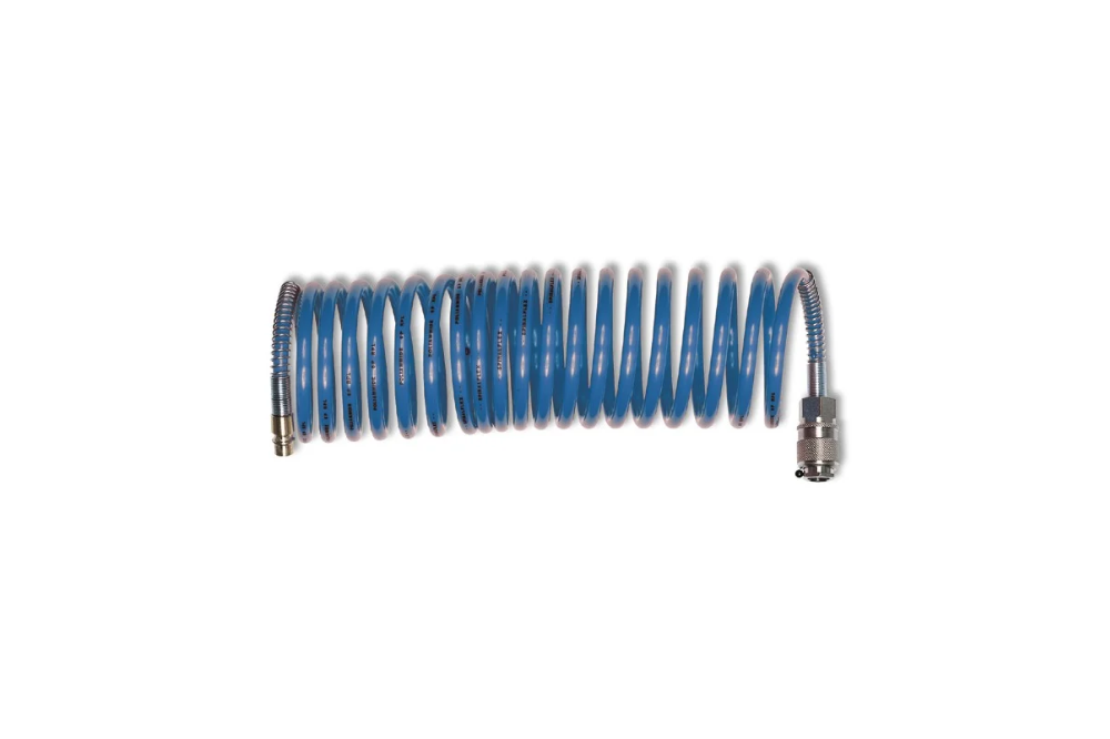 Spiraalslang 5m in polyamide met geheugeneffect. Geleverd met universele snelkoppeling en orion (ARO 210) steeknippel Verkrijgbaar in lengten van 5m, 7.5m en 10m Voorzien van een knikbeveiliging